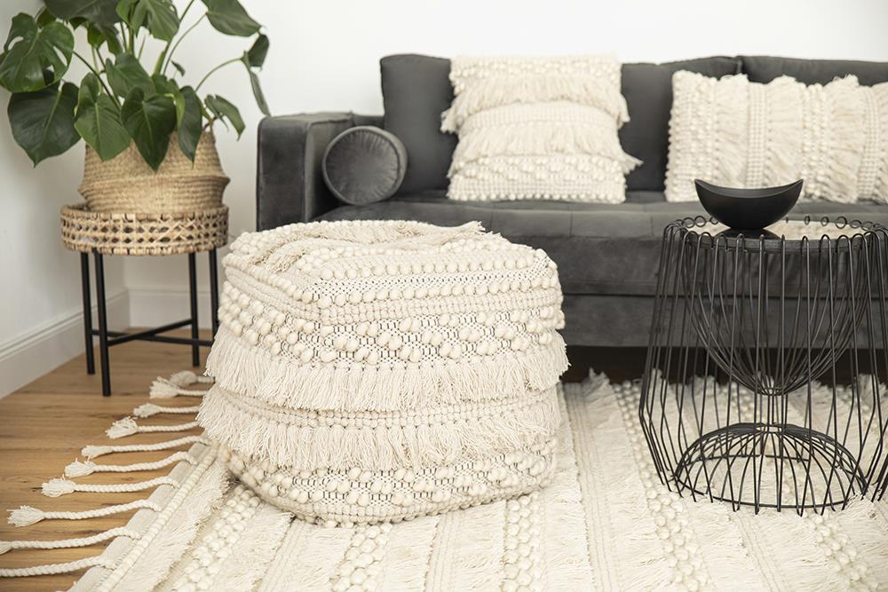 Dieser Hocker bringt eine angenehme Atmosphäre mit sich und sorgt für ein entspanntes Raumklima. Seine Beschaffenheit an sich vermittelt bereits beim Ansehen einen einladenden Eindruck. Die schön platzierten Fransen und Quasten, welche typisch für den Boho-Style sind, unterstreichen zusätzlich sein Erscheinungsbild. Dank dieser Strukturen sind sie charaktergebend bei unterschiedlich einfallendem Licht. Eingesetzt als Element in der Gestaltung einer Vielzahl von Innenräumen, hinterlässt er bleibenden Eindruck in Wohnräumen und mausert sich so zum Stilelement schlechthin.Seine Funktionalität ist zudem nicht zu vernachlässigen. Die hervorragende Polsterung sorgt für wunderbares Sitzerlebnis und lädt zum Verweilen ein. Die Varianten unterscheiden sich durch eine Bauweise mit oder ohne Beine aus schönem Holz, welche in beiden Ausführungen sehr stabil sind. Das verwendete Obermaterial besteht aus reiner Wolle. Das Naturmaterial ist belastbar und leicht in der Pflege. Das aus Neuseeland stammende Material wurde in Handarbeit produziert und genügt so höchsten Ansprüchen an Qualität.