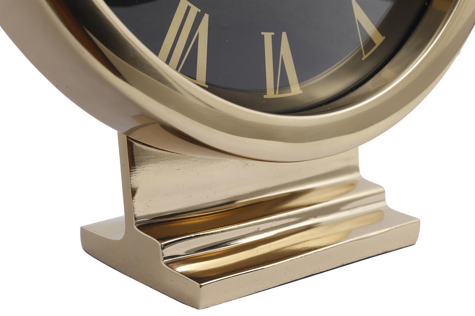 Diese formschöne Tischuhr beweist, dass Uhren längst nicht mehr nur dazu da sind, die Zeit anzuzeigen. Stattdessen ist die dekorative Uhr gleichermaßen praktisch wie schön und stellt dies stilsicher auf dem Esstisch, Nachtschränkchen oder Fensterbrett zur Schau. Die klassische runde Form erhält durch das schwarze, markante Ziffernblatt mit römischen Zahlen einen eleganten Look, den der glänzende Metallrahmen harmonisch abrundet. Als absoluter Hingucker verleiht die dekorative Tischuhr Küchen, Wohn- oder Schlafzimmern den letzten modischen Schliff und lässt sie mit der Zeit gehen.